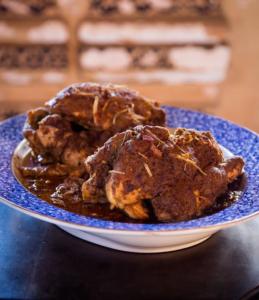 Chicken slow-cooked in an onion-based spiced sauce accompanied by milk solids covered in silver and gold leaf, served with khameeri roti and chapati